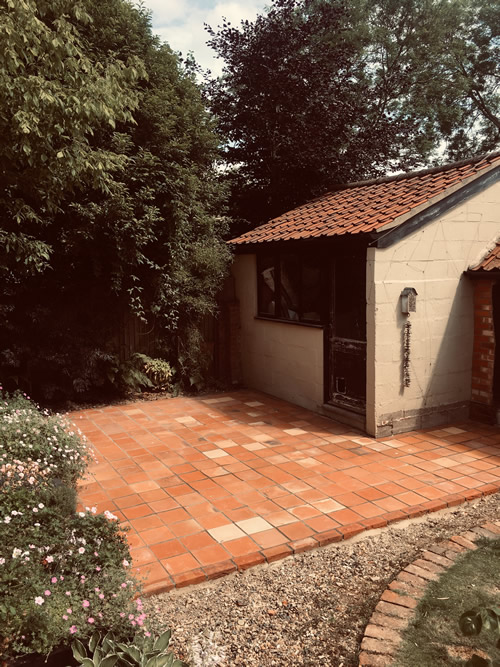 Colourful Garden Grade/thirds have been skilfully laid as a patio which connects the house and outbuilding.