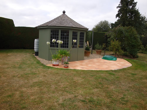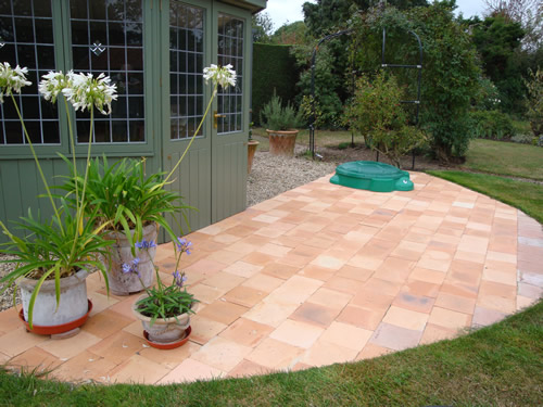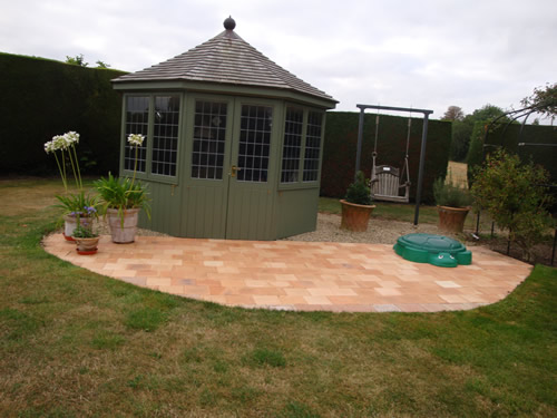 The patio of mixed Heritage Pink 9" x 9" x ¾" pamments complements the style of the charming summerhouse.